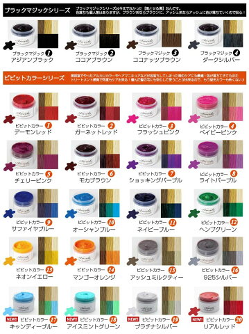 」 トリートメント感覚でカラーもできるカラーバターはエクステやパーマをしていても色ムラになりにくくキレイに染まります! しかも色素補給をしながら染まるので、傷んだ髪をケアしてツヤツヤサラサラの髪に! また、市販の黒染めよりも自然に色が落ちていくので色戻しにも使えます! 商品名 魔法のカラートリートメント カラー ・ブラックマジック:アジアンブラック(1) ・ブラックマジック:ココアブラウン(2) ・ブラックマジック:ココナッツブラウン(3) ・ブラックマジック:ダークシルバー(4) ・ビビットカラー:デーモンレッド(1) ・ビビットカラー:ガーネットレッド(2) ・ビビットカラー:フラッシュピンク(3) ・ビビットカラー:ベイビーピンク(4) ・ビビットカラー:チェリーピンク(5) ・ビビットカラー:モカブラウン(6) ・ビビットカラー:ショッキングパープル(7) ・ビビットカラー:ライトパープル(8) ・ビビットカラー:サファイヤブルー(9) ・ビビットカラー:オーシャンブルー(10) ・ビビットカラー:ネイビーブルー(11) ・ビビットカラー:ヘンプグリーン(12) ・ビビットカラー:ネオンイエロー(13) ・ビビットカラー:マンゴーオレンジ(14) ・ビビットカラー:アッシュミルクティー(15) ・ビビットカラー:925シルバー(16) ・ビビットカラー:キャンディーブルー(17) ・ビビットカラー:アイスミントグリーン(18) ・ビビットカラー:プラチナシルバー(19) ・ビビットカラー:リアルレッド(20) 使用方法 髪全体に塗布して揉み込むように馴染ませます。