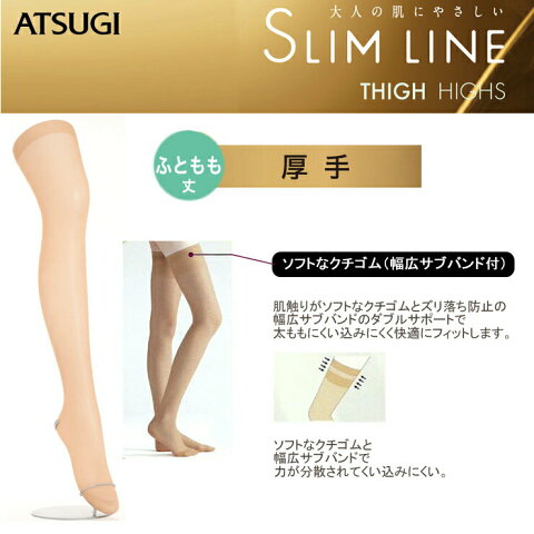 サイズ 22〜25cm 特徴 ATSUGI SLIM LINE(アツギ スリムライン) 大人の肌にやさしいストッキング ●3足組 ●厚手ふともも丈 ●DCY交編 ●クチゴムソフト ソフトなクチゴムと幅広サブバンドで力が分散されてくい込みにくい ●消臭ポリウレタン使用 ●コラーゲン+スクワラン加工 ●つま先補強 ●足型セット加工 ●MADE IN JAPAN(日本製) 配送 こちらの商品はネコポス送料無料でお届けします。