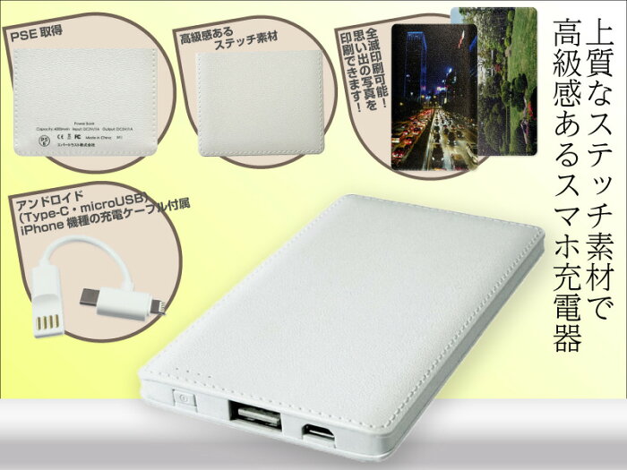 PSE適合品iPhone・マイクロ USB・Type−C機種が使えるケーブル付き! 商品説明 アイフォン・アンドロイドも利用できるスマホ充電器アイフォン・マイクロUSB・type-c機種が使えるケーブル付きステッチ加工の上質素材全面印刷も可能。
