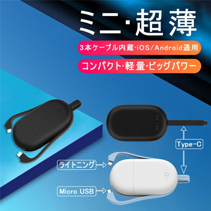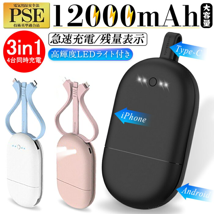モバイルバッテリー 12000mAh 大容量 高輝度LEDライト 3種ケーブル内蔵(ライトニング+Micro USB+Type-C) 完全ケーブル不要 Type-C入力 USBポート PSE認証済 送料無料